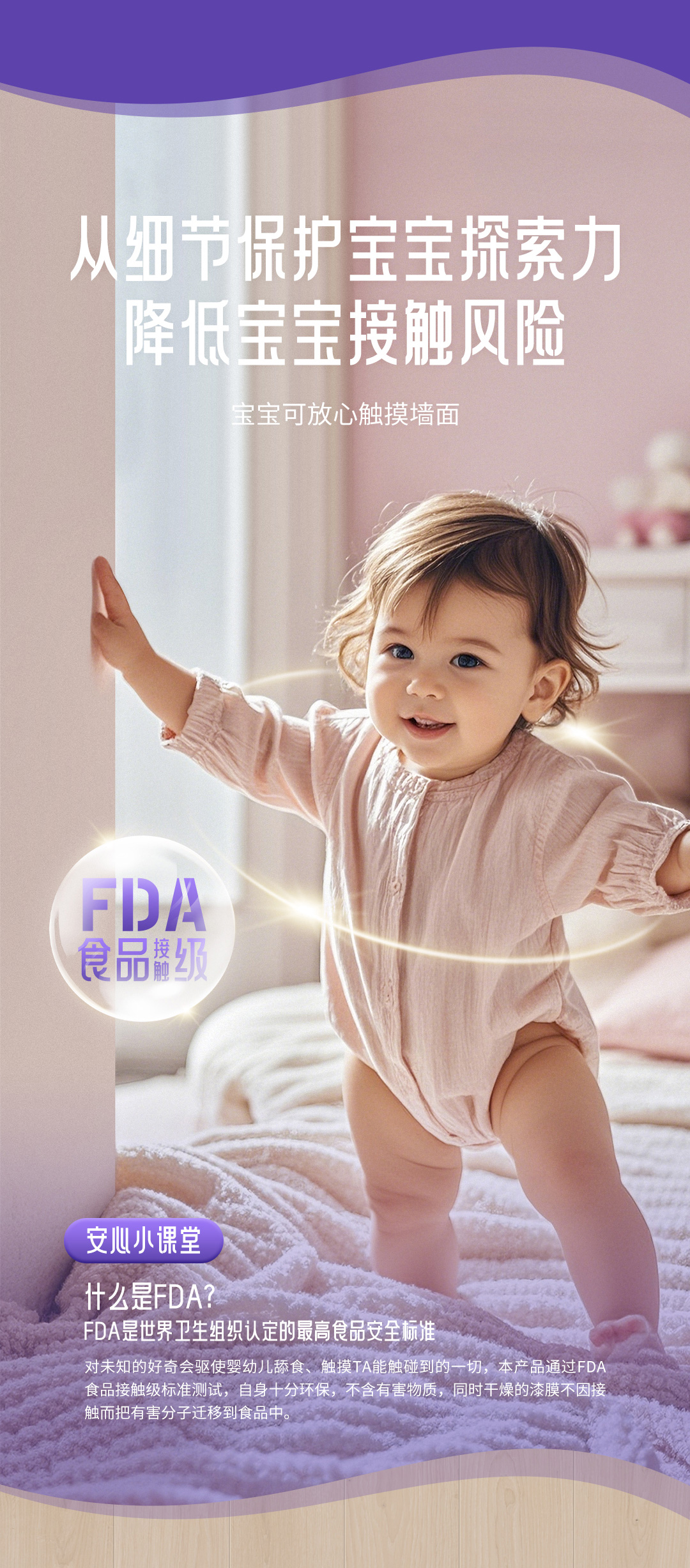 welcome海洋之神食品接触级母婴漆是一款专为母婴研发设计的全能型环保墙面漆甄选绿色环保原料、抗醛优质乳液具有高科技净化空气技术气味更清新更环保。产品符合美国FDA食品接触级标准让孩子净享海洋般的自然、清新与健康在抗污方面采用天然生物贝壳粉使产品漆膜细腻达到I级抗污水彩笔可随意涂鸦随时随地还宝宝一个干净、洁白的墙面产品更是可以刷出多种质感纹理效果同时具有护敏抗病毒、超强耐擦洗功能银离子抗菌高达99.99有效抵御墙面各种常见细菌。真爱的呵护总是细致入微让每一位家人都能净享清新的家居环境。
