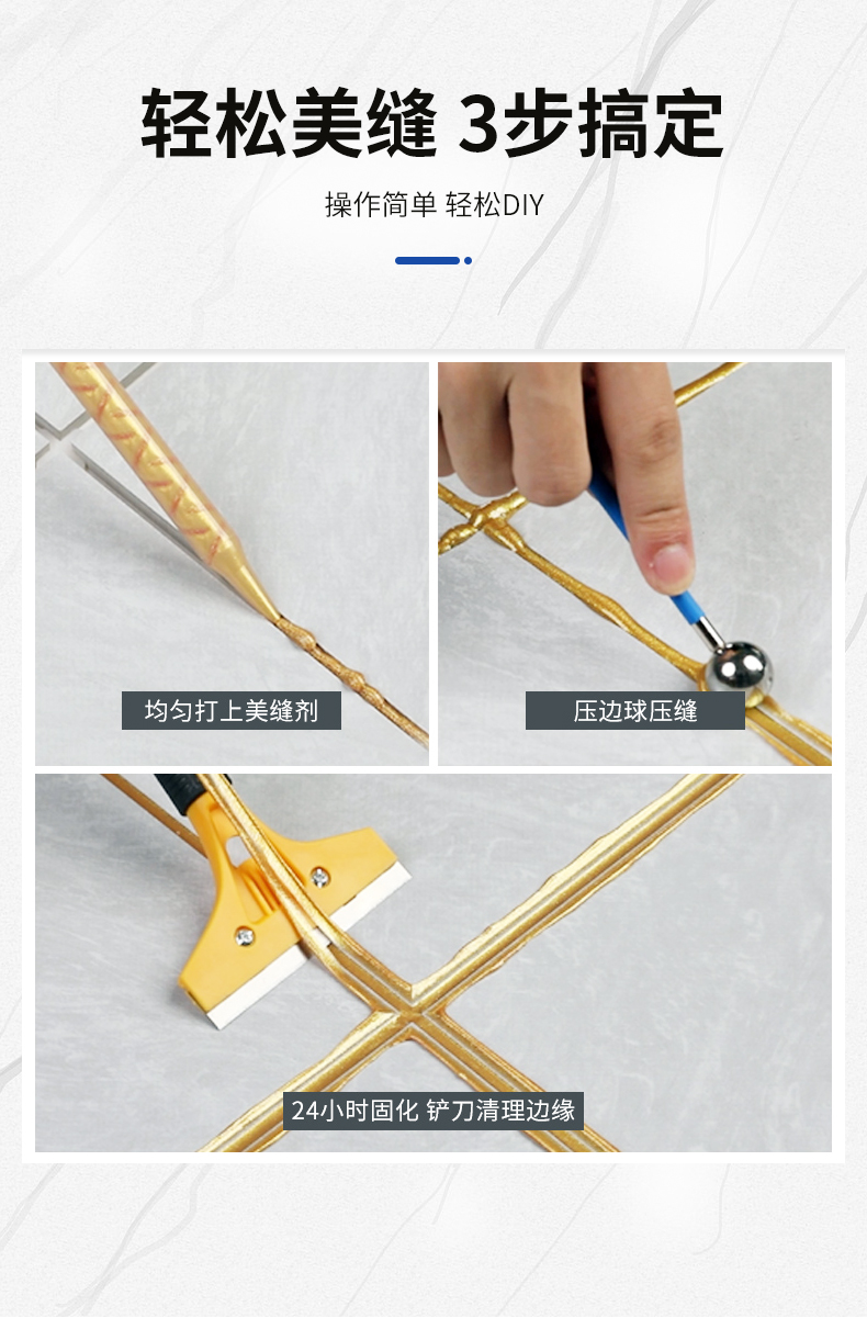 美易涂金装防霉美缝剂拥有独特釉面晶莹亮泽,色彩丰富、鲜艳,色差小。同时还具备防霉效果,使瓷砖缝隙可以拖洗,减少缝隙滋生细菌概率,耐酸碱,耐洗刷,耐水泡,耐油污,稳定性强,不收缩,不开裂,不粉化,绿色环保,无任何有毒气体及重金属,对人体和环境无任何危害。