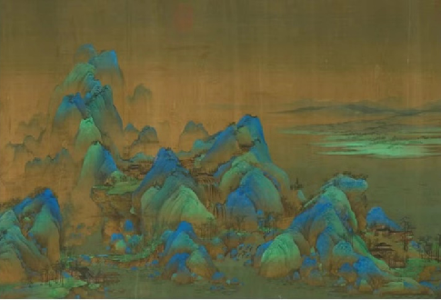 《千里江山图》画卷构图周密,色彩绚丽,用笔精细,画面着意刻划的自然景色,既概括地表现了山势绵亘、水天一色的浩森气象,又精心地勾画了幽岩邃谷、高峰平坡、流溪飞泉、波涛烟霭等自然界变幻无穷的状态,使千里江山既开阔无垠,又曲折入微,充分地显示了祖国山河的壮丽多姿。