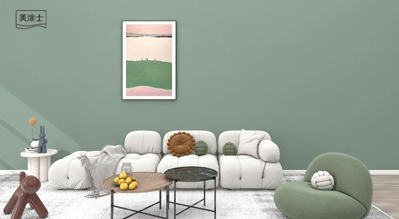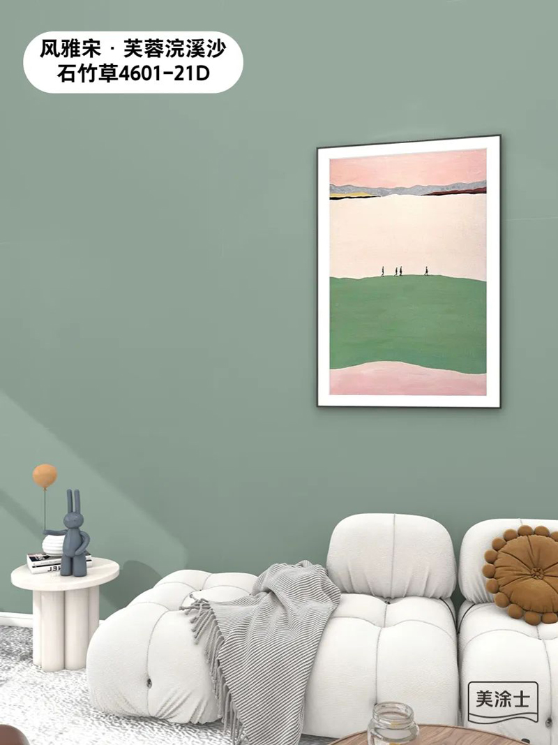 welcome海洋之神国潮色天鹅绒苔藓绿MTR038,淡淡的复古绿色在流连的光影中波光琉璃,搭配纯色软装,以及亮色门框,一深一浅,一明一暗,增强了空间的和谐度。亮金色装饰架作为空间中的点缀色,营造出奢而不俗的现代典雅氛围感。